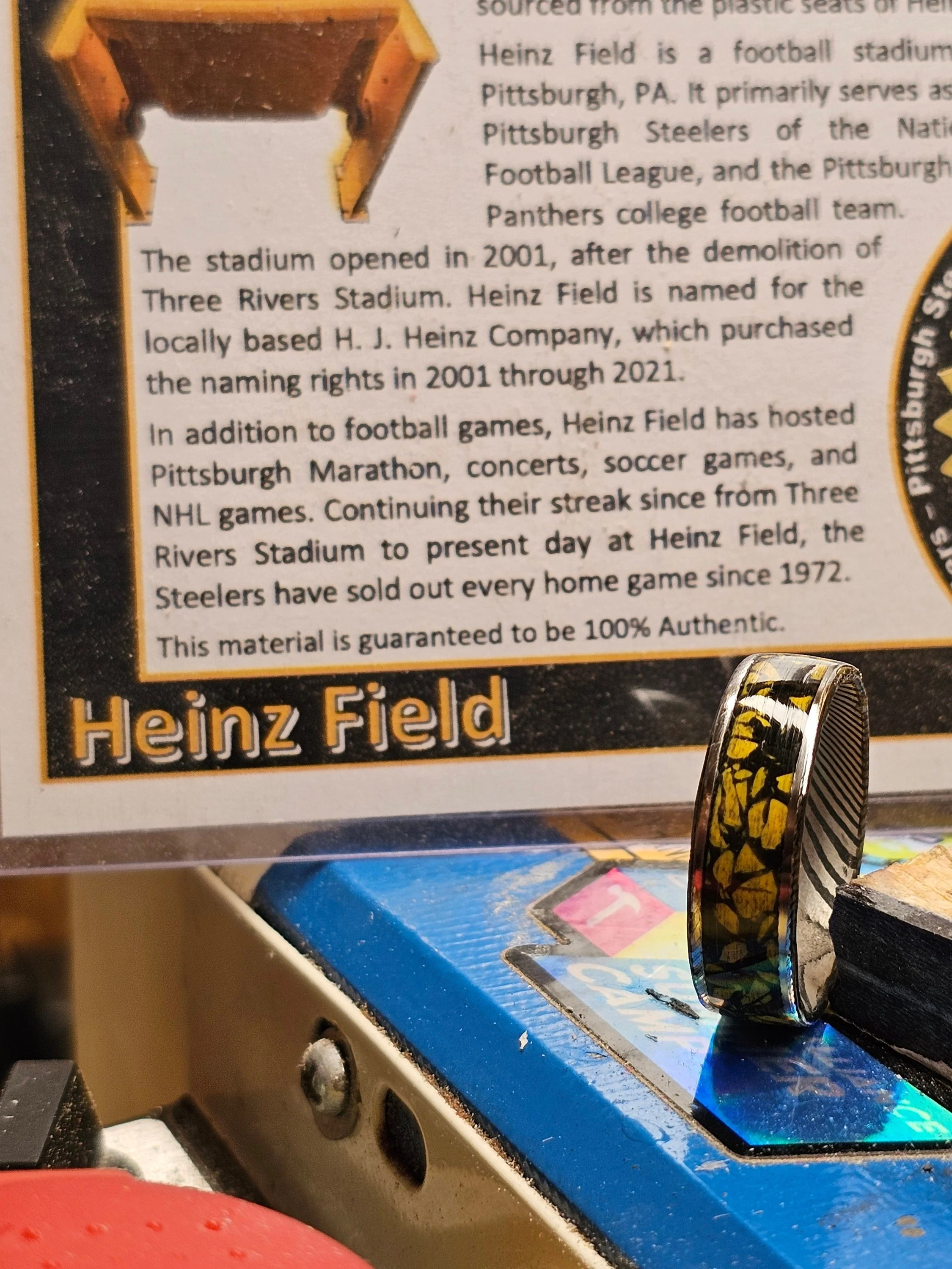 The Pittsburgh Steelers ring, featuring seat material from Heinz Field